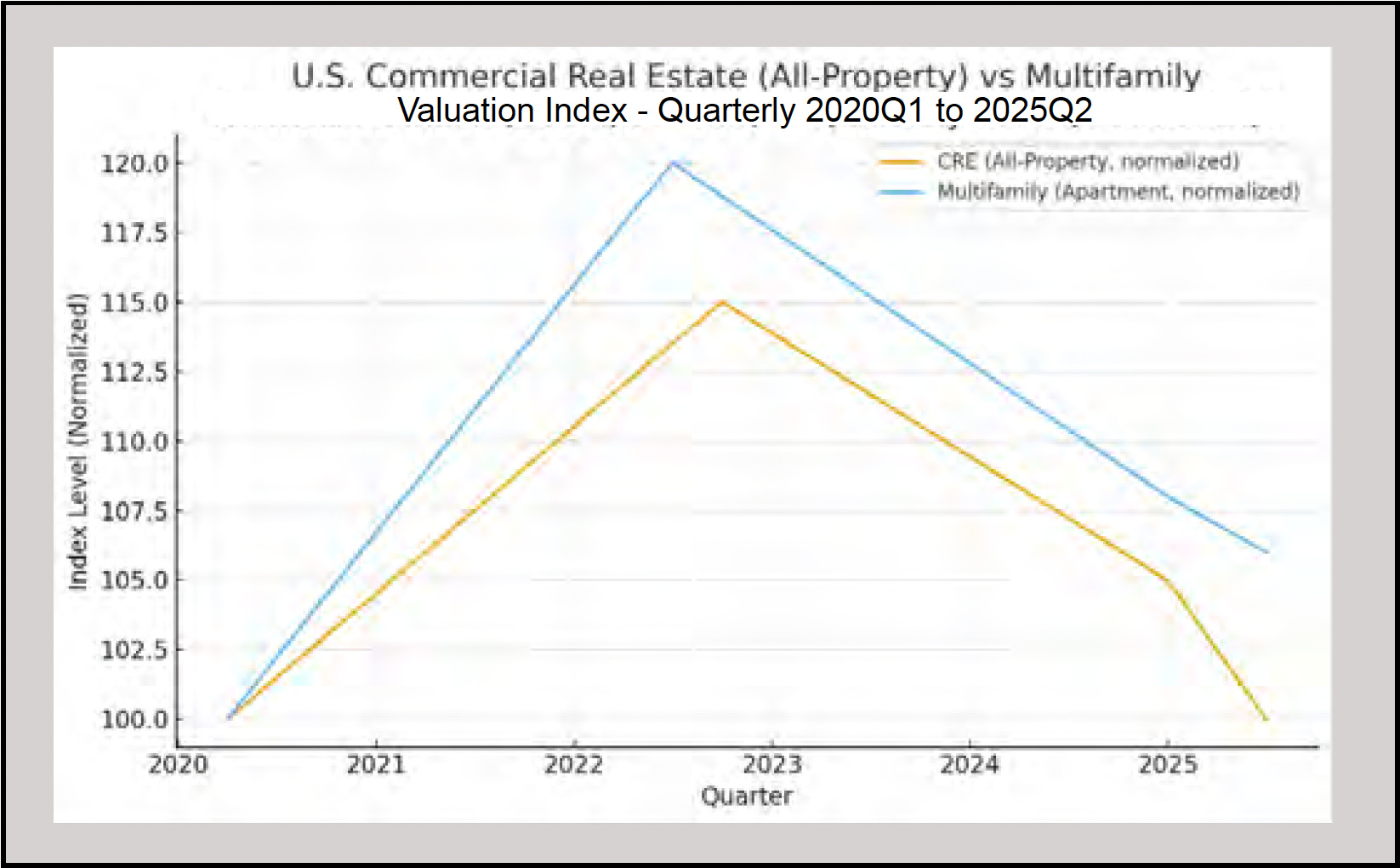 - Valuations have normalized across commercial property sectors, with multifamily values retracting much of their pandemic-era gains.